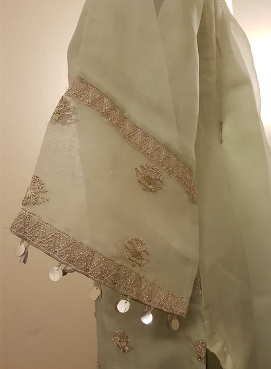 V-necked LIGHT BLUE organza kurta features traditional embroidery